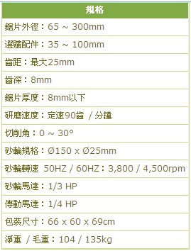 - 研磨速度為固定式,每分鐘為90齒。