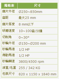 摩擦式鋸片研磨機是以直立式鋸片研磨方式可以使你輕鬆的操作機器,經過多年的精心設計與構想而製造出一部專業級的鋸片研磨機其優點部分所有的調整桿,均做了合理的排列,讓操作者可以很容易調整鋸齒的切削角,背隙角,齒深及齒距其專利的鋸片厚度調整,鋸片厚度經兩個同動的機構同時挾持,可將鋸片挾持在中心位置,所以不必再手動調整鋸片厚度.同時因為將鋸片挾持研磨,所以可降低研磨時的噪音. 鋸片研磨機與其它不同的鋸片研磨機多了一個無段變速,使用變頻器來控制研磨速度,可隨齒距的變化來調整所需要的研磨速度. 鋸片研磨機經過電腦精密計算模擬,所設計出的工業級的專業齒形凸輪,使你的鋸片研磨更為簡單與快速精準. 鋸片研磨機所有的鑄鐵均採用球狀石墨鑄鐵(FCD-45),並經回火處理,以確保精度及增加耐磨性,鋸片研磨機主要採用SKD11高碳鋼,並經熱處理研磨,推臂彈簧經過改良,使用迴轉式彈簧,不易彈性疲乏,確保進給準確. 鋸片進給軸支持座,使用高強度銅合金作基材,埋入高科技技術製造之固體潤滑劑,其高負荷,耐磨耗的特性更達到完全無給油功能,進給軸使用ψ30mm,加大軸心並經熱處理及研磨. 集於以上的特點,鋸片研磨機是可以快而準確的研磨出一片鋒利的鋸片.
